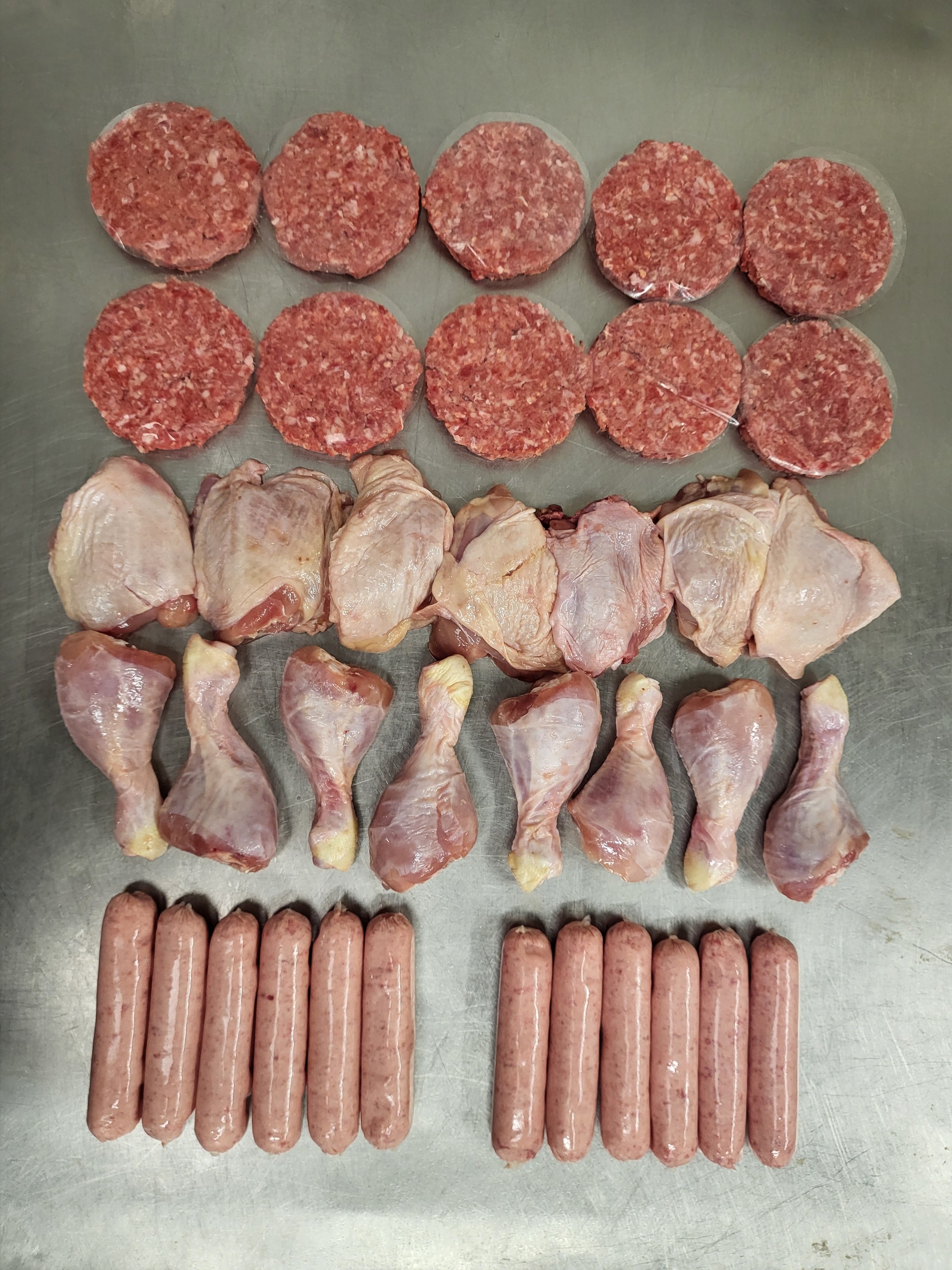 1x 1kg chicken thighs 1x 1kg chicken drumsticks 10x 4oz steak burgers 2x 6 traditional sausage